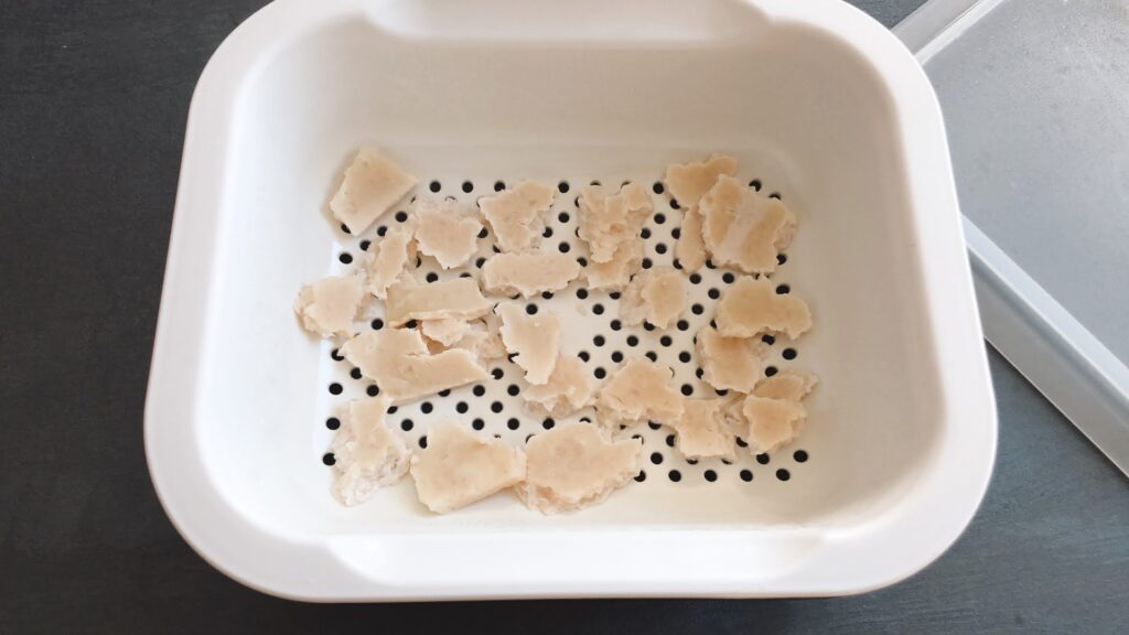 ①酒粕を厚み1センチ以下、サイズ3㎝以内にカットして、600Wで4~5分。