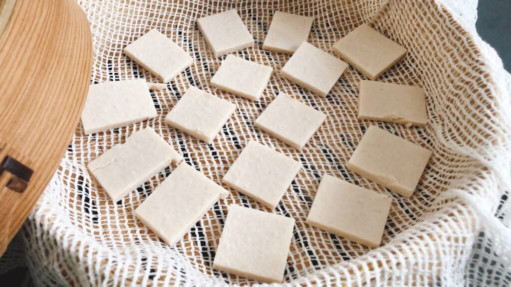 厚み2センチ以下、サイズ5㎝以内に酒粕をカットします。(厚みは薄いほどよくアルコールが飛びます)
